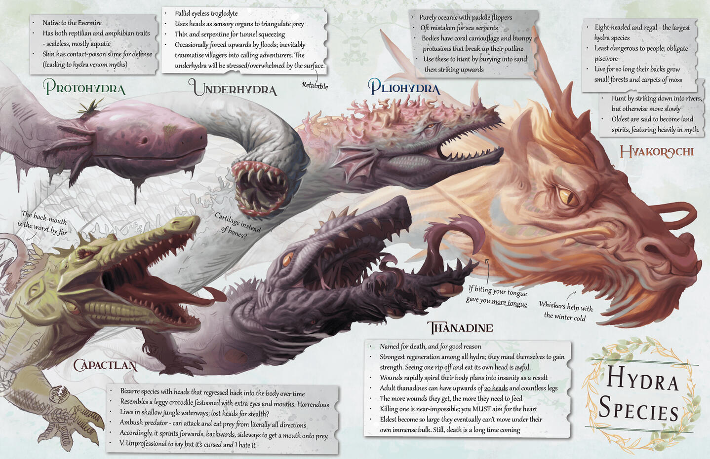 I've written and designed a range of Indie TTRPG projects, including adventures for Mappa Mundi, an introductory Realm for Mythic Bastionland, and supplemental missions and extra vampires for the rip-roaring Eat The Reich.Pictured - Spreads from an unreleased personal project on fantasy ecology, and p.8-9 from Jotunrift, for Mythic Bastionland.